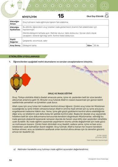 Etkinliğin Bu etkinlik, öğrencilerin oruç tutarken irade göstermenin önemini fark edebilmeleri için